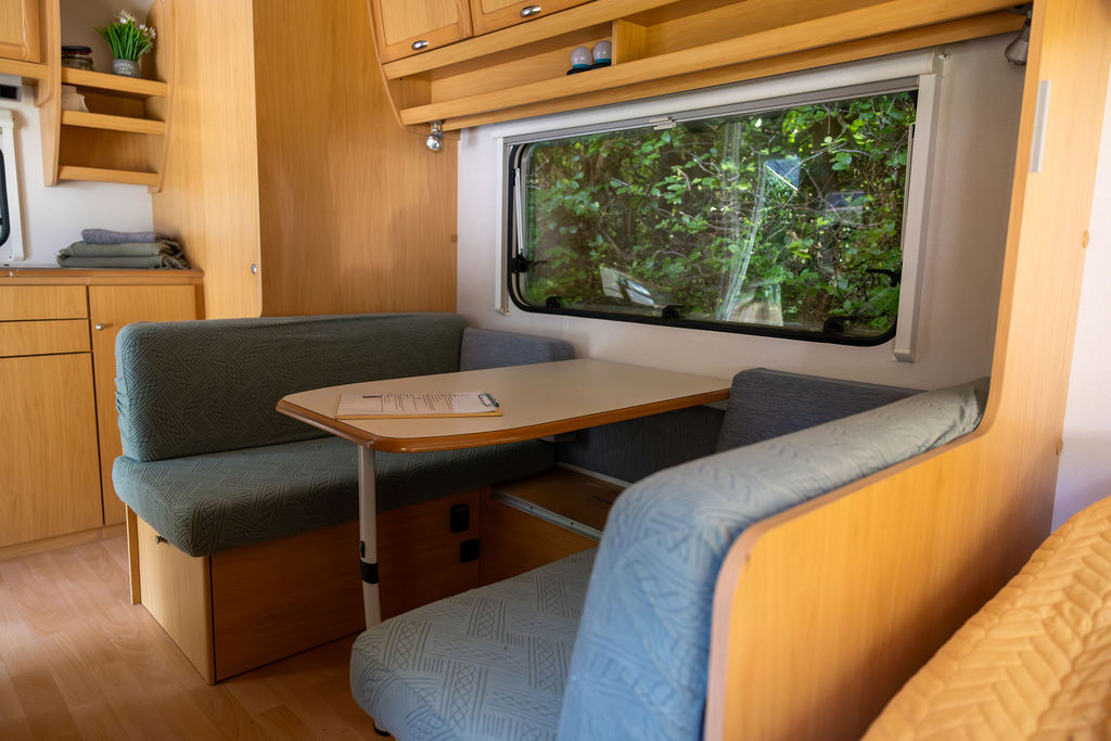 På vores mini campingplads tilbyder vi en hyggelig caravan, HyggeVan, til leje.