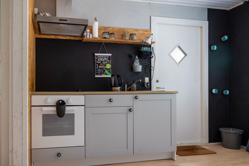 Køkken-alrummet er fuldt udstyret og har alle bekvemmeligheder, herunder elkedel, kaffemaskine, induktionskogeplade og ovn. Perfekt til at tilberede en lækker måltid selv og nyde den i ro og mag.