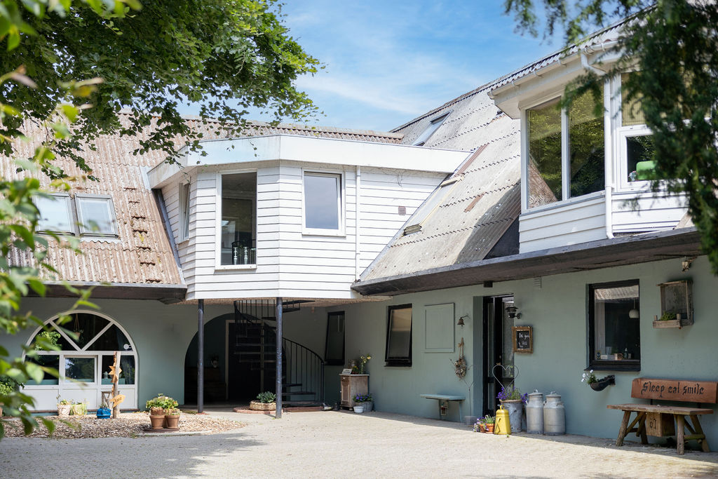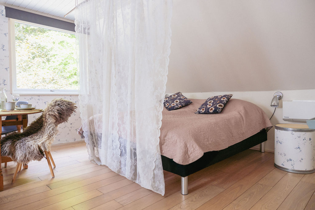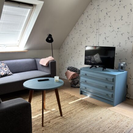 3 personer Guesthouse Smukt ligger på første sal og nås via en karakteristisk rund udendørs trappe.
