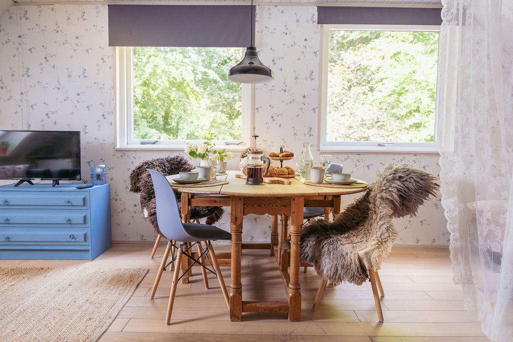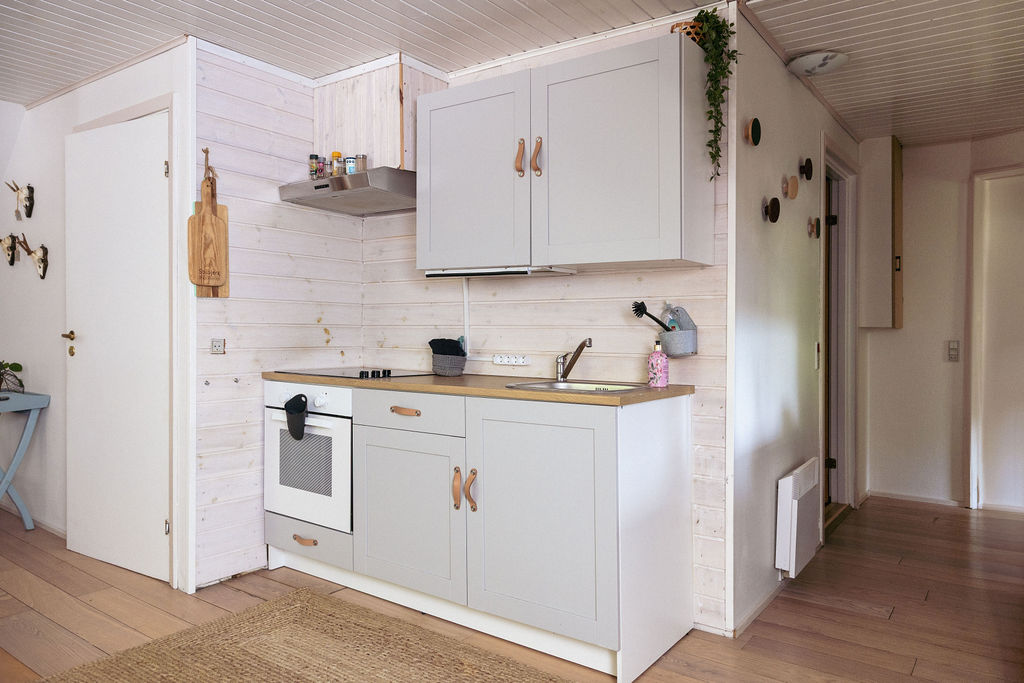 Den rummelige og lyse køkken-stue er fuldt udstyret og har to komfortable sofaer, et fjernsyn og et hyggeligt spisebord med stole – perfekt til at slappe af sammen eller nyde et måltid.