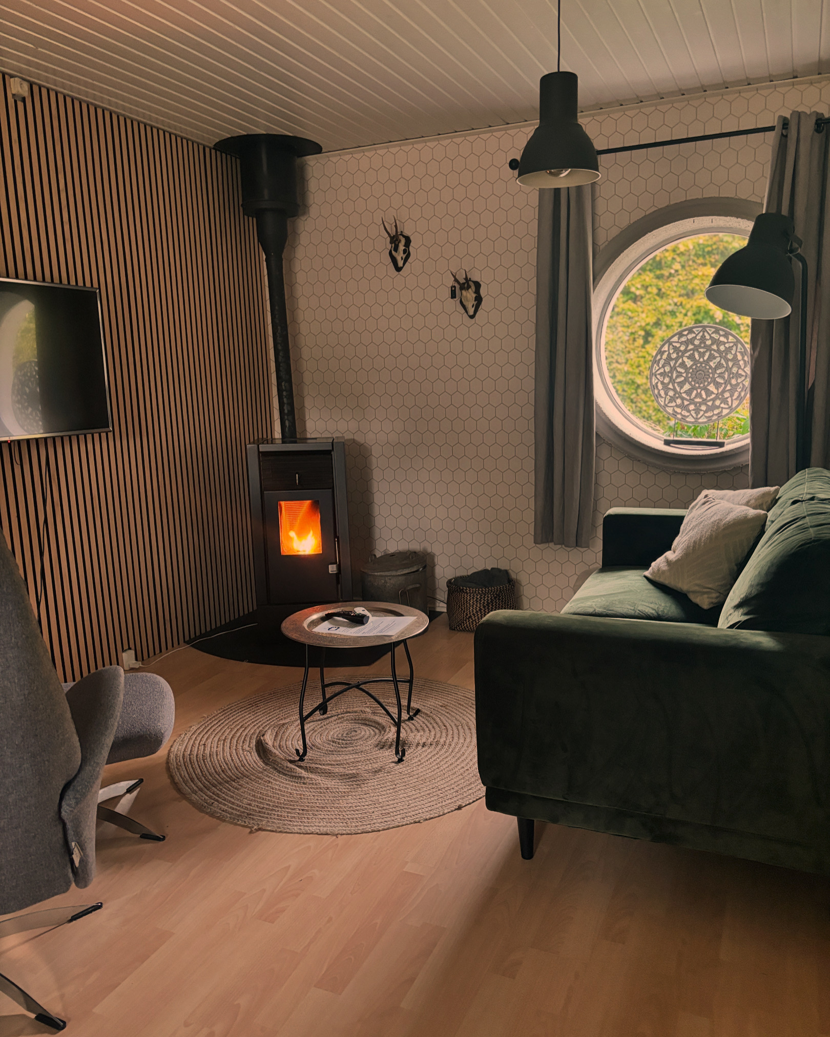 Binnen ervaar je direct een warme en gezellige sfeer dankzij de knusse palletkachel en de comfortabele zithoek .